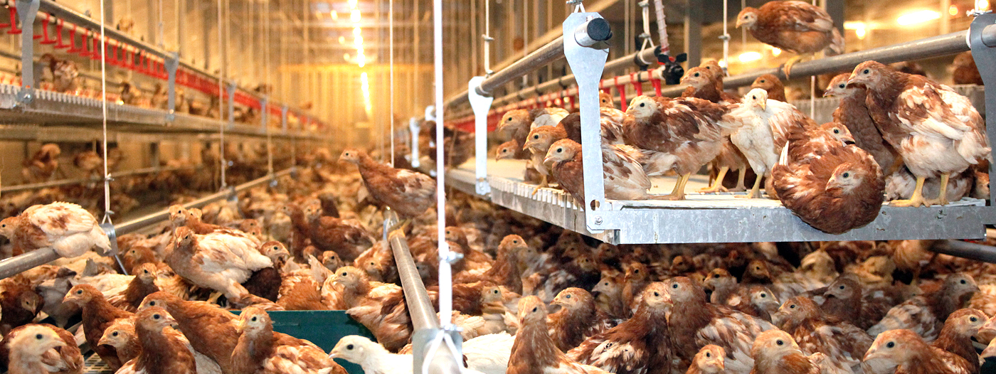The Jansen Nivo Varia is a cage free rearing system which produces active and healthy pullets for a future in an aviary or cage free rearing system. The system consists of a portal frame system with tilting and winchable slats, which are raised as the birds grow to teach them to jump and fly.